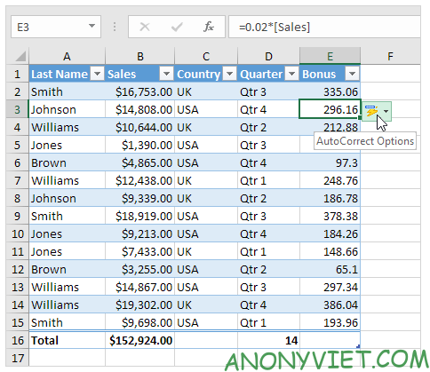 • Chọn ô E1, nhập ‘Bonus’ và nhấn Enter. Excel sẽ tự động định dạng cột.