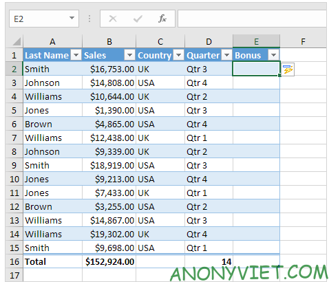 • Chọn ô E1, nhập ‘Bonus’ và nhấn Enter. Excel sẽ tự động định dạng cột.