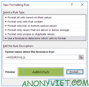 Hàm MOD chia số thứ tự hàng cho 2 và trả về số dư. Dựa vào số dư, bạn có thể định dạng hàng chẵn hoặc lẻ.