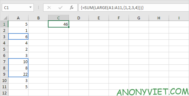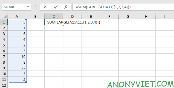 Công thức mảng giúp bạn tính toán trên nhiều giá trị cùng lúc. Hằng số mảng được tạo bởi hàm LARGE sẽ được lưu trữ trong bộ nhớ của Excel.