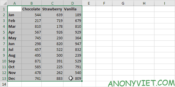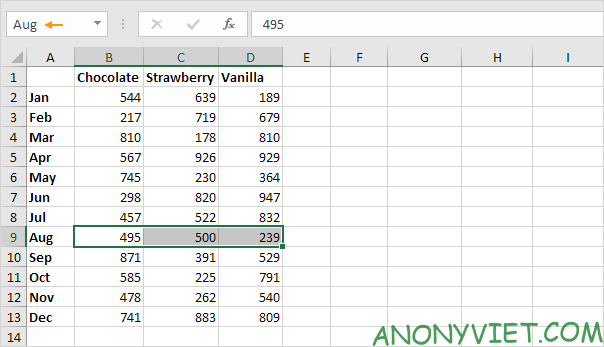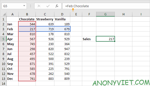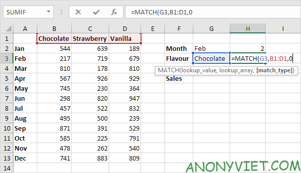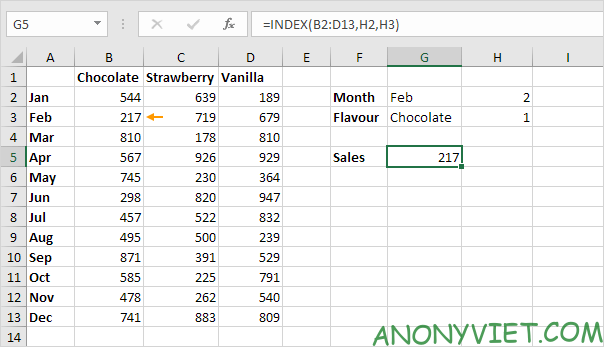 Sau khi xác định được vị trí, bạn có thể sử dụng hàm INDEX để lấy giá trị tương ứng. Ví dụ, để tìm doanh số bán Chocolate trong tháng Hai, bạn sẽ kết hợp kết quả từ hàm MATCH với hàm INDEX.