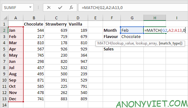 Bạn có thể sử dụng hàm MATCH để tìm vị trí của một giá trị trong một phạm vi. Ví dụ, để tìm tháng 2 trong phạm vi A2:A13, sử dụng hàm MATCH sẽ trả về kết quả là 2.