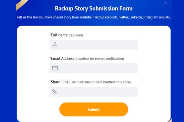 - Bước 3: Truy cập trang sự kiện AOMEI Backupper, điền thông tin cá nhân và đường dẫn bài viết của bạn.