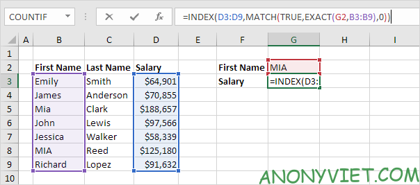 Để khắc phục vấn đề này, bạn có thể sử dụng kết hợp các hàm INDEX, MATCH và EXACT.