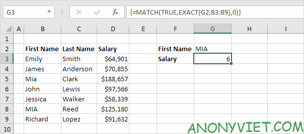 Tiếp theo, sử dụng hàm MATCH để tìm vị trí của giá trị TRUE trong mảng mà hàm EXACT tạo ra.
