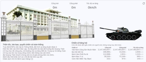 Trò chơi này, còn được gọi là “Tiến về Sài Gòn”, mô phỏng trực tuyến sự kiện lịch sử ngày 30/4/1975. Người chơi vào vai kíp xe tăng 390, điều khiển xe tăng tiến vào Dinh Độc Lập, tái hiện một cách sống động khoảnh khắc lịch sử.